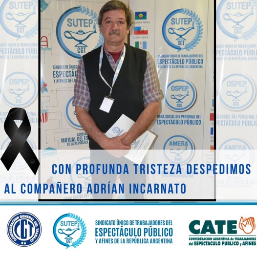 La Comisión Directiva Central del SUTEP, lamenta informar el fallecimiento del compañero Adrián Incarnato, Secretario General de la Rama Electricistas de Teatro del SUTEP, Seccional Buenos Aires.